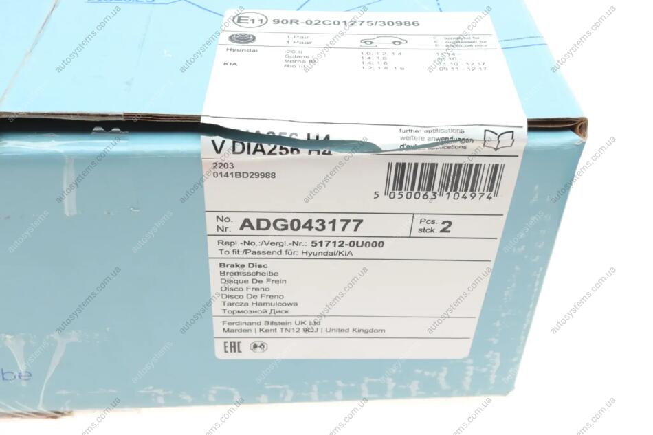 Диск гальмівний (передній) Kia Rio III/Hyundai i20 11- (256x22) Blue-print ADG043177