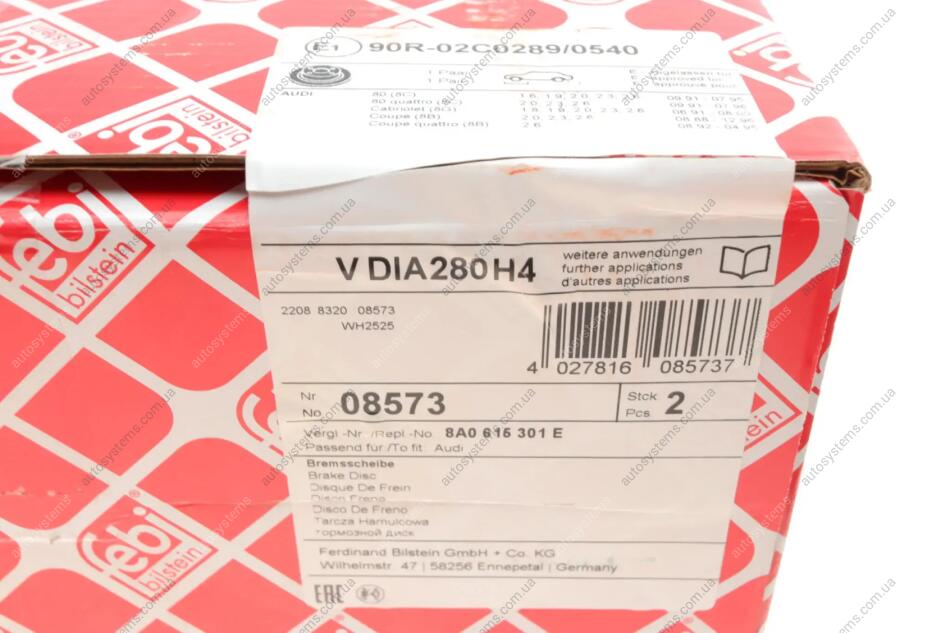 Диск гальмівний (передній) Audi 80/Coupe/Cabriolet 1.6-2.6 88-00 (280x22) FEBI BILSTEIN 08573