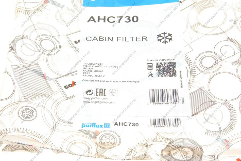 Фільтр салону VW Polo 1.0TSI/2.0GTI/Seat Ibiza 1.0TSI/1.6TDI 17- (вугільний) Purflux AHC730