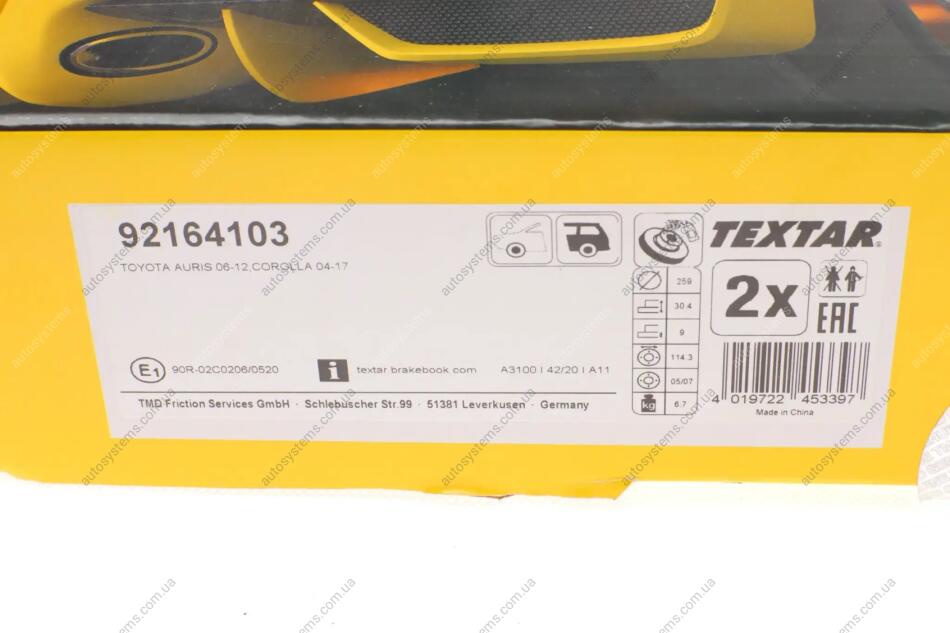Диск гальмівний (задній) Toyota Auris/ Corolla 06- (259x9) PRO TEXTAR 92164103