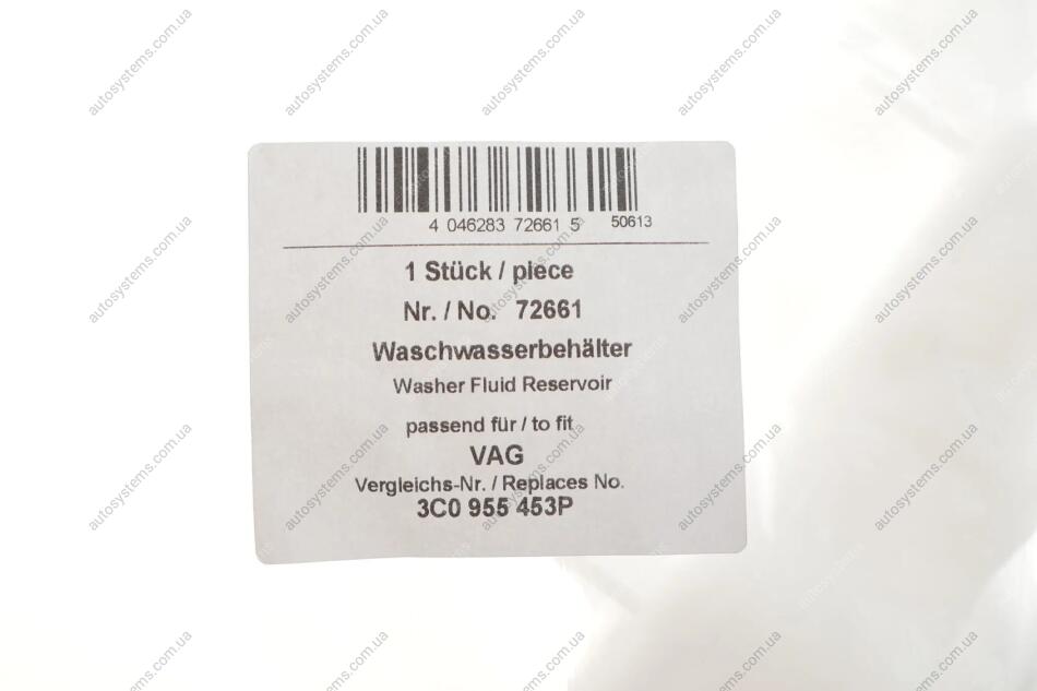 Autosystems є найкращим рішенням для придбання запчастин для вантажівок та інших видів транспорту. Компанія пропонує широкий вибір деталей та вигідні умови замовлення. Бачок омивача VW Passat 05-11 AIC 72661 відповідає оригіналу 3C0955453H, 3C0955453P та встановленим стандартам. Підходить на вантажні автомобілі -.