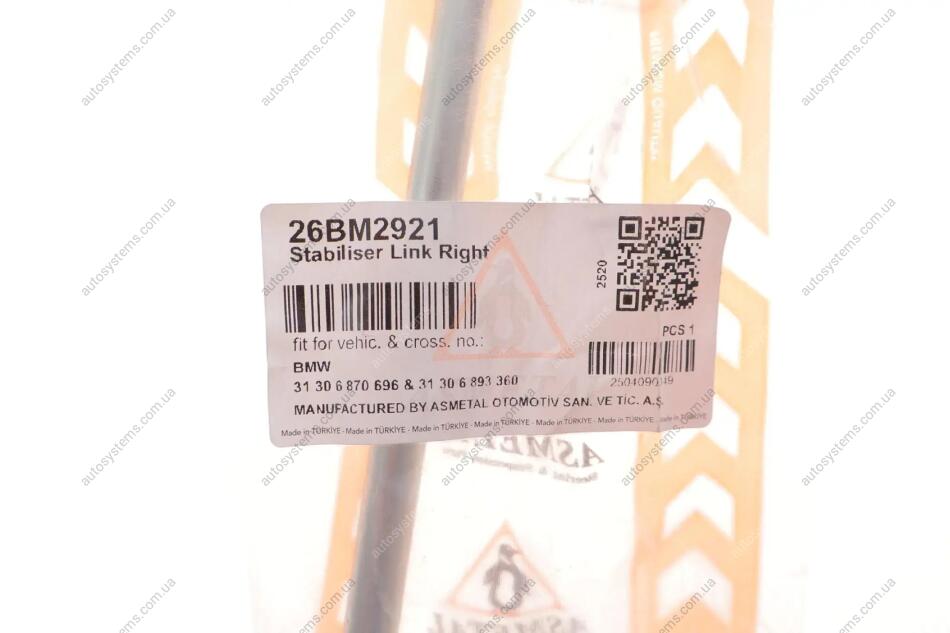 Autosystems є найкращим рішенням для придбання запчастин для вантажівок та інших видів транспорту. Компанія пропонує широкий вибір деталей та вигідні умови замовлення. Тяга стабілізатора (переднього) (R) BMW 3 (G20/G80/G28) 18- B47/B48/B57/B58 ASMETAL 26BM2921 відповідає оригіналу 6893360, 6870696, 31306893360 та встановленим стандартам. Підходить на вантажні автомобілі -.