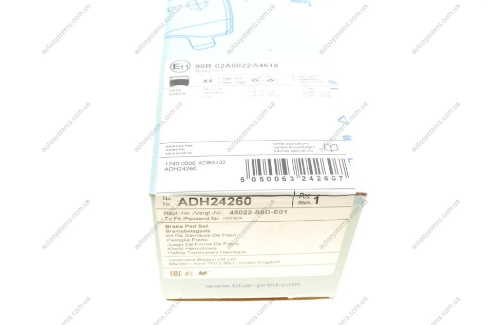 Колодки гальмівні (передні) Honda Civic VI/VII 94-05/Concerto 89-95/Rover 400 90-00 Blue-print ADH24260