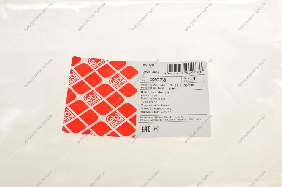 Шланг гальмівний (передній) BMW 3 (E30)/5 (E60/E61)/6 (E63/E64)/7 (E65/E66/E67) 82-10 (L=327mm) FEBI BILSTEIN 02078