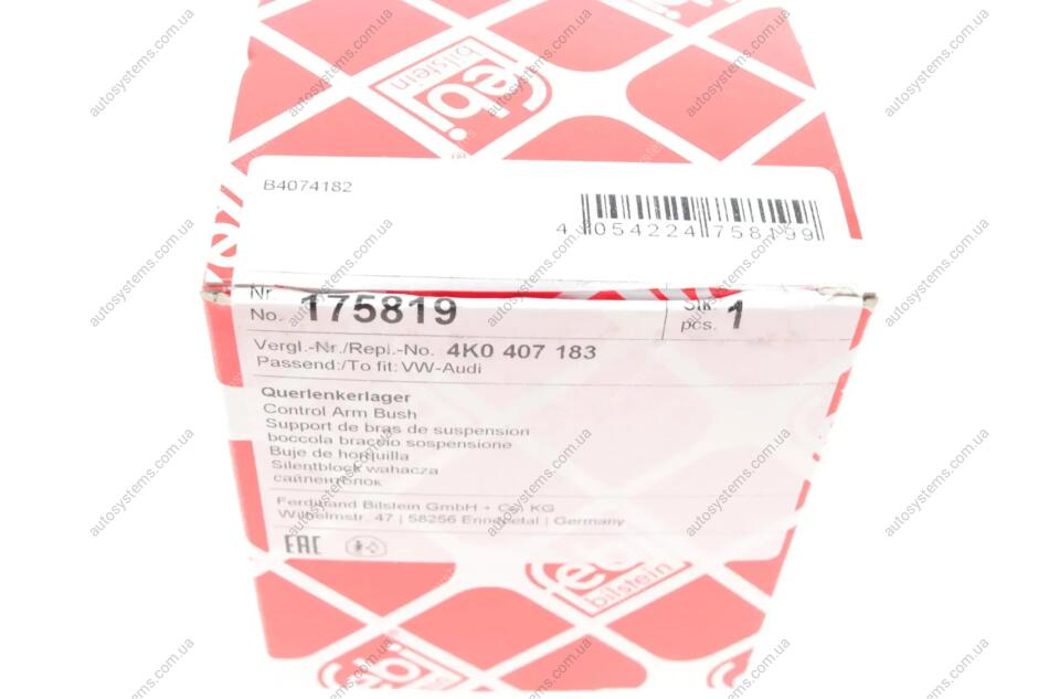 Autosystems є найкращим рішенням для придбання запчастин для вантажівок та інших видів транспорту. Компанія пропонує широкий вибір деталей та вигідні умови замовлення. Сайлентблок важеля (переднього/знизу/ззаду) Audi A6/A7/Q5 17- FEBI BILSTEIN 175819 відповідає оригіналу 4K0407183, 4K0407183A, 4K0407183B та встановленим стандартам. Підходить на вантажні автомобілі -.