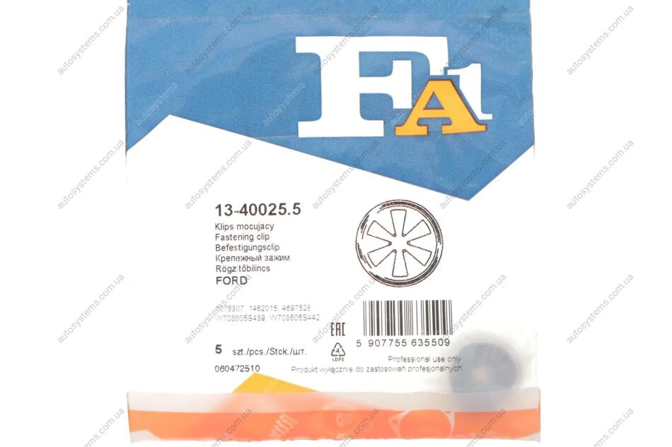 Autosystems є найкращим рішенням для придбання запчастин для вантажівок та інших видів транспорту. Компанія пропонує широкий вибір деталей та вигідні умови замовлення. Клипса крепления молдинга Fischer Automotive One (FA1) 13-40025.5 відповідає оригіналу 1075307, 1462015, 4697528 та встановленим стандартам. Підходить на вантажні автомобілі -.