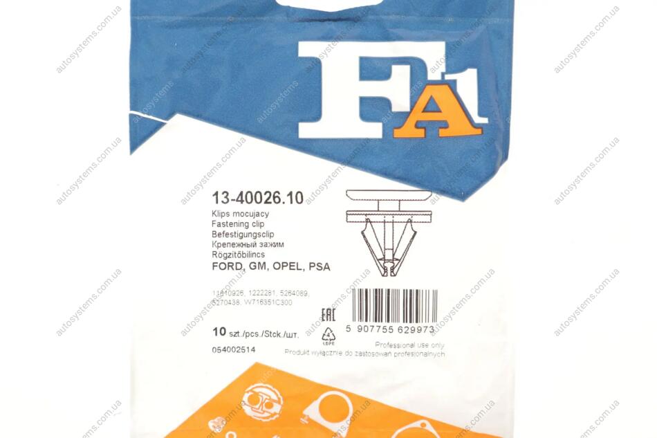 Autosystems є найкращим рішенням для придбання запчастин для вантажівок та інших видів транспорту. Компанія пропонує широкий вибір деталей та вигідні умови замовлення. Клипса крепления молдинга Fischer Automotive One (FA1) 13-40026.10 відповідає оригіналу 5264089, 5270438, W716351C300 та встановленим стандартам. Підходить на вантажні автомобілі -.