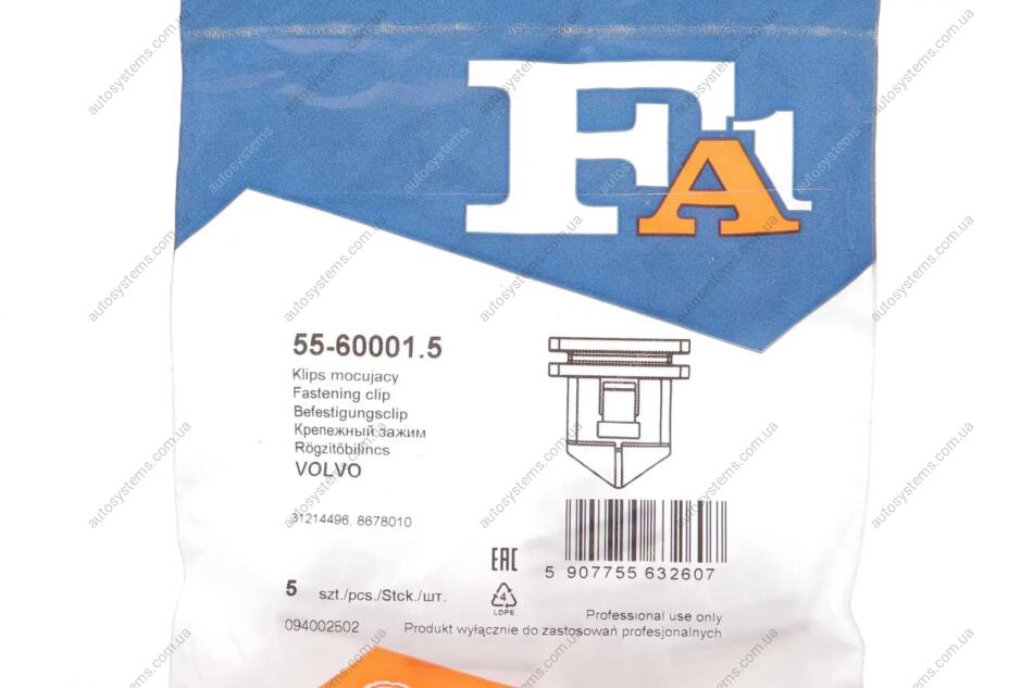 Autosystems є найкращим рішенням для придбання запчастин для вантажівок та інших видів транспорту. Компанія пропонує широкий вибір деталей та вигідні умови замовлення. Клипса крепления молдинга Fischer Automotive One (FA1) 55-60001.5 відповідає оригіналу 8678010, 31214496 та встановленим стандартам. Підходить на вантажні автомобілі -.