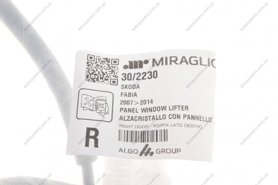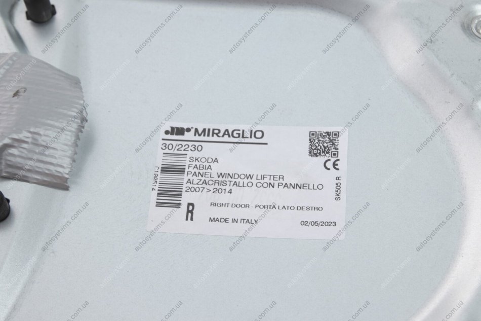 Склопідіймач (передній) Skoda Fabia 07-14 (R) (електро) (без моторчика) (з пластиною) MIRAGLIO 30/2230