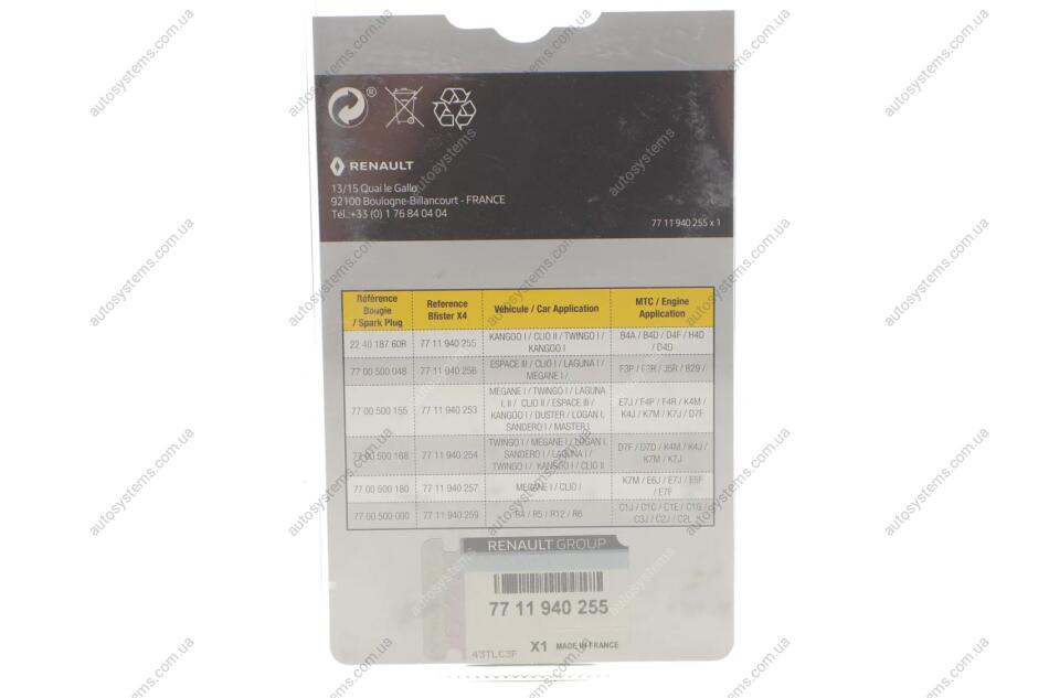 Свеча зажигания RENAULT 77 11 940 255