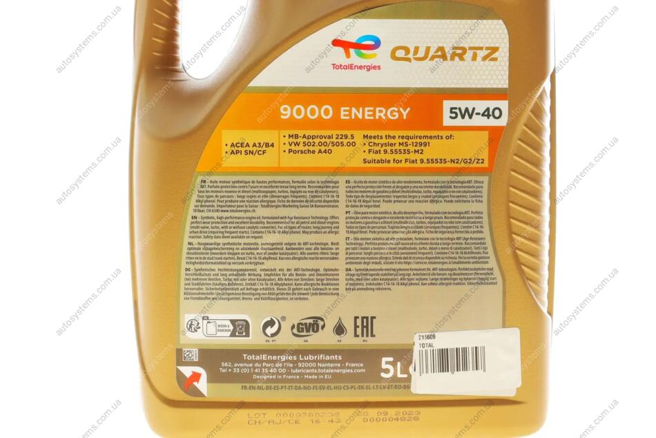 Олива 5W40 Quartz 9000 Energy (5L) (MB229.1/VW502.00/505.00) TOTAL 216609 - переваги покупки в інтернет-магазині Autosystems